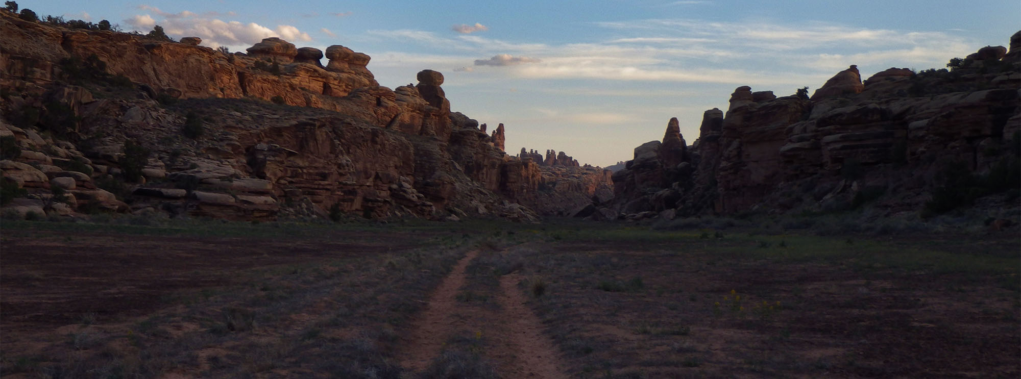 Pushing on the scenery was great. Looking behind me was an amazing sight with the Needles to the south peeking up from the walled-in corridor of Cyclone Canyon. Some older maps show a spring here, but I saw ZERO sign of water.