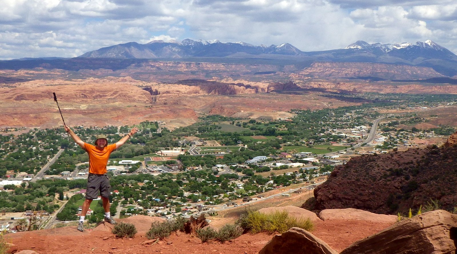 BUT… I wouldn’t let that detour me of my official goal. Sure, they took my pack and refilled my water with some ice-cold good stuff… but I still continued walking as they drove farther up the canyon to take in the sights. In fact, I even walked UP to the Moab Rim just to get this sight of city that I’d longed for: