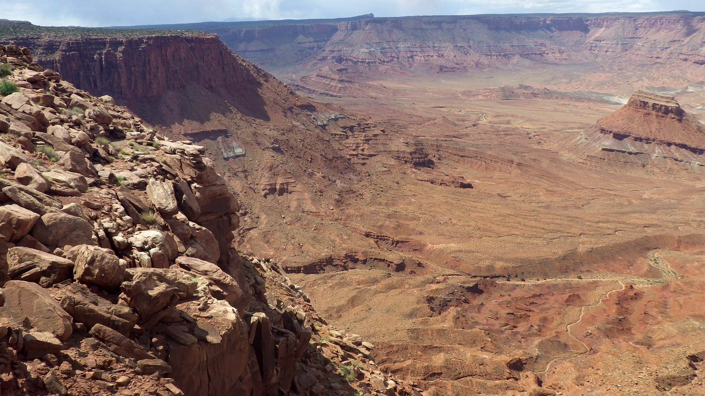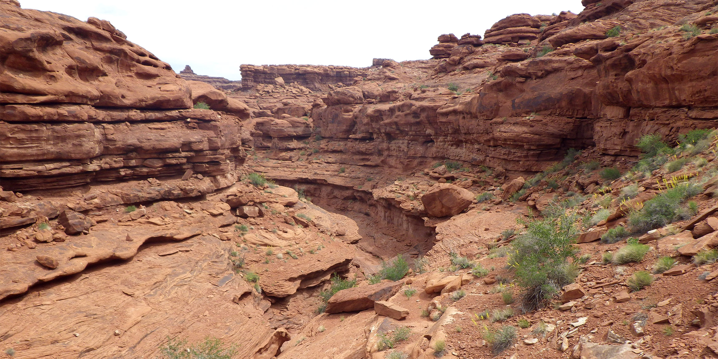 This got me to the lower level. From here I stayed in the main drainage. The route from here on looks daunting so last time I swung to the north into another drainage which was quite rough and now I know… that was a mistake. The main drainage though it looks bad from the top is an easy stair step walk down and the bottom section is easy as it dumps one right out to the magic crack that leads to the bottom of Indian Creek. This is the lower section of the descent route: