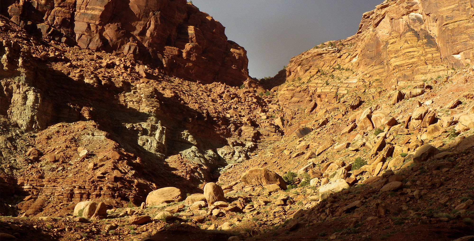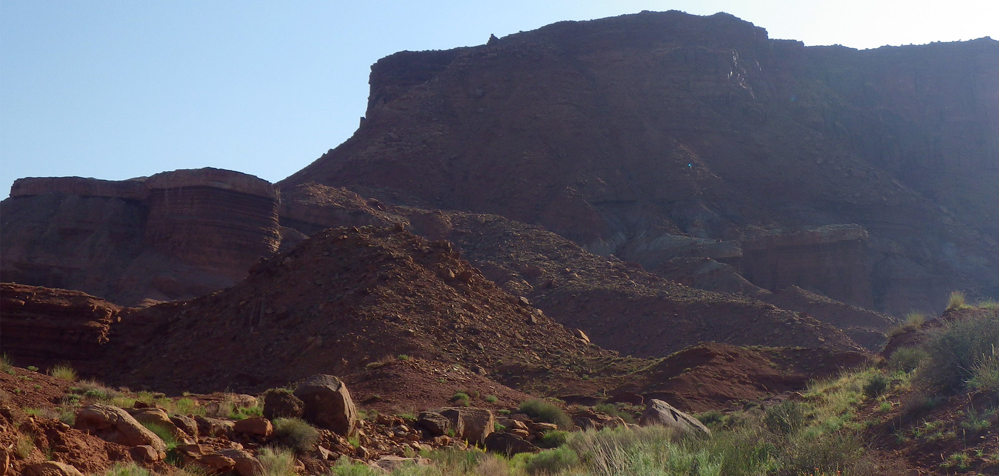 From this point I decided to leave the route of the Hayduke Trail and its circuitous and dry route north to the Colorado River. Instead I wanted to climb a huge talus slope to connect a previous scouting trip of mine atop Hatch Mesa. I was now staring at that climb and it looked incredibly daunting. If I hadn’t already been on the top and stared down this incline, I’m not sure I would ever attempt it. It was a colorful mix of rocks , mud and talus and thus I dubbed it the Striped Monster. It was late enough in the day that I decided to wait until the morning to officially embark on this part of the journey.