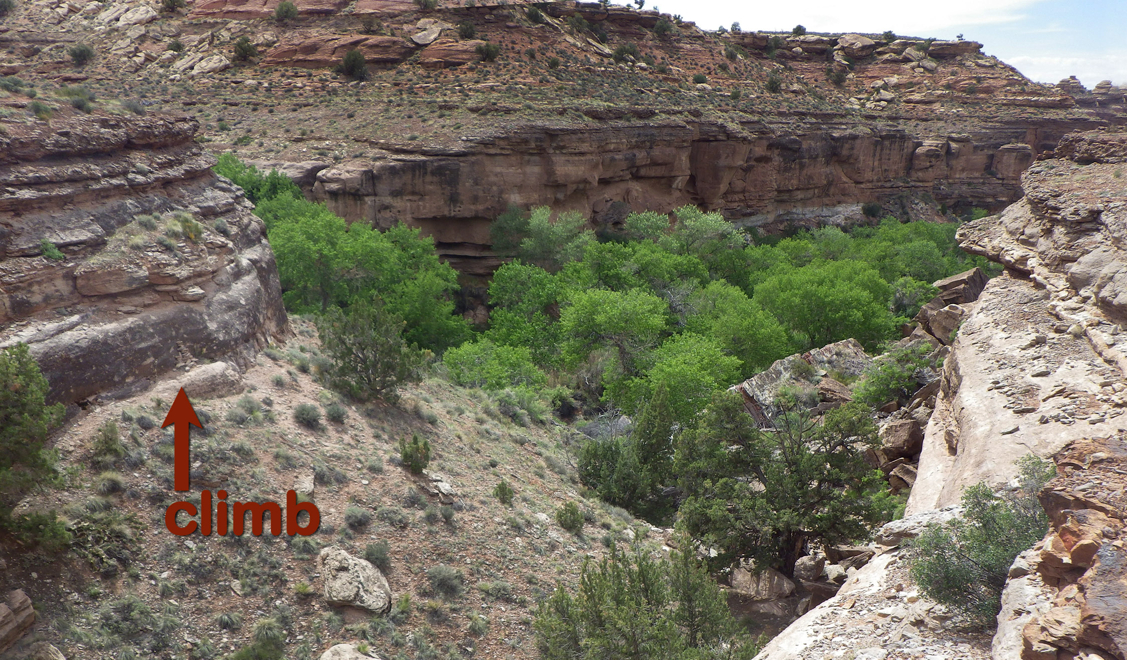 Nearing Big Spring Overlook I needed water so I followed the wash down to the dryfall and looked down to the lush area below with cottonwoods and a flowing stream. I had to follow the rim for quite a ways before I found a spot that I could climb down and fill up my jugs. This would be a tough climb with a big pack — especially if one was solo. The water ran clear and was plentiful. The scene once down the ledge: