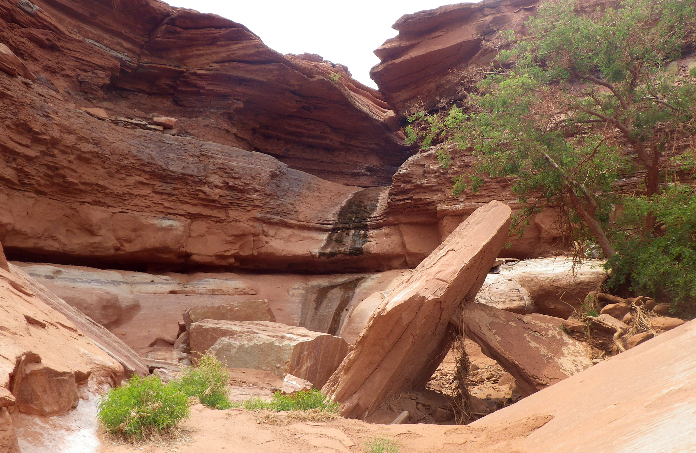 Back down in the main canyon there is an small arch along the wall on the northern side, and then soon after the bottom of the canyon begins to fill with brush as I approach the spring. Soon the brush is incredibly thick as the water starts to run. I stop for an extended break in this lush oasis and refill the jugs. From here the route leaves Little Spring canyon via the side drainage to the SE. This drainage immediately ends in a dryfall, but it’s possible to climb the steep slope on one side to get to a ledge system near the top. I’d done this before, but this time out it was much harder. I had to push my pack above my head to the small ledge and then climb up the 8 foot ledge with barley any hand holds. A pile of loose rocks on the bottom is there to give one an assist. This is VERY tricky (and slightly dangerous) for the solo backpacker. If solo and less than 6’2″, one may wish to bypass this. Once one has filled up with water I’m fairly certain it it would be possible to backtrack to the upper dryfall and then rim-walk to this same point.