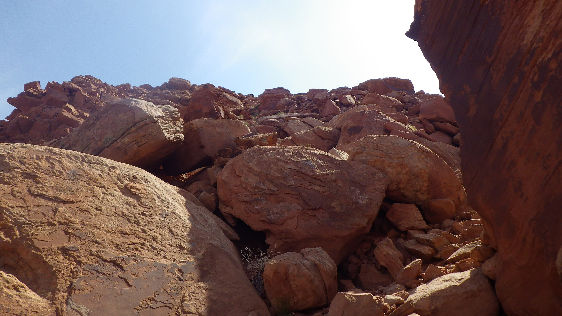 After checking out the petroglyphs on the huge boulder by the road, I walked down canyon just a bit before leaving the road again to tackle my next challenge — climbing back up to the canyon rim via another jumble of boulders. This gulch I’d also scouted from the top last fall, but again it looked much more difficult from the bottom. It was getting late in the day so I’d started up the slope so that I could camp up on top.