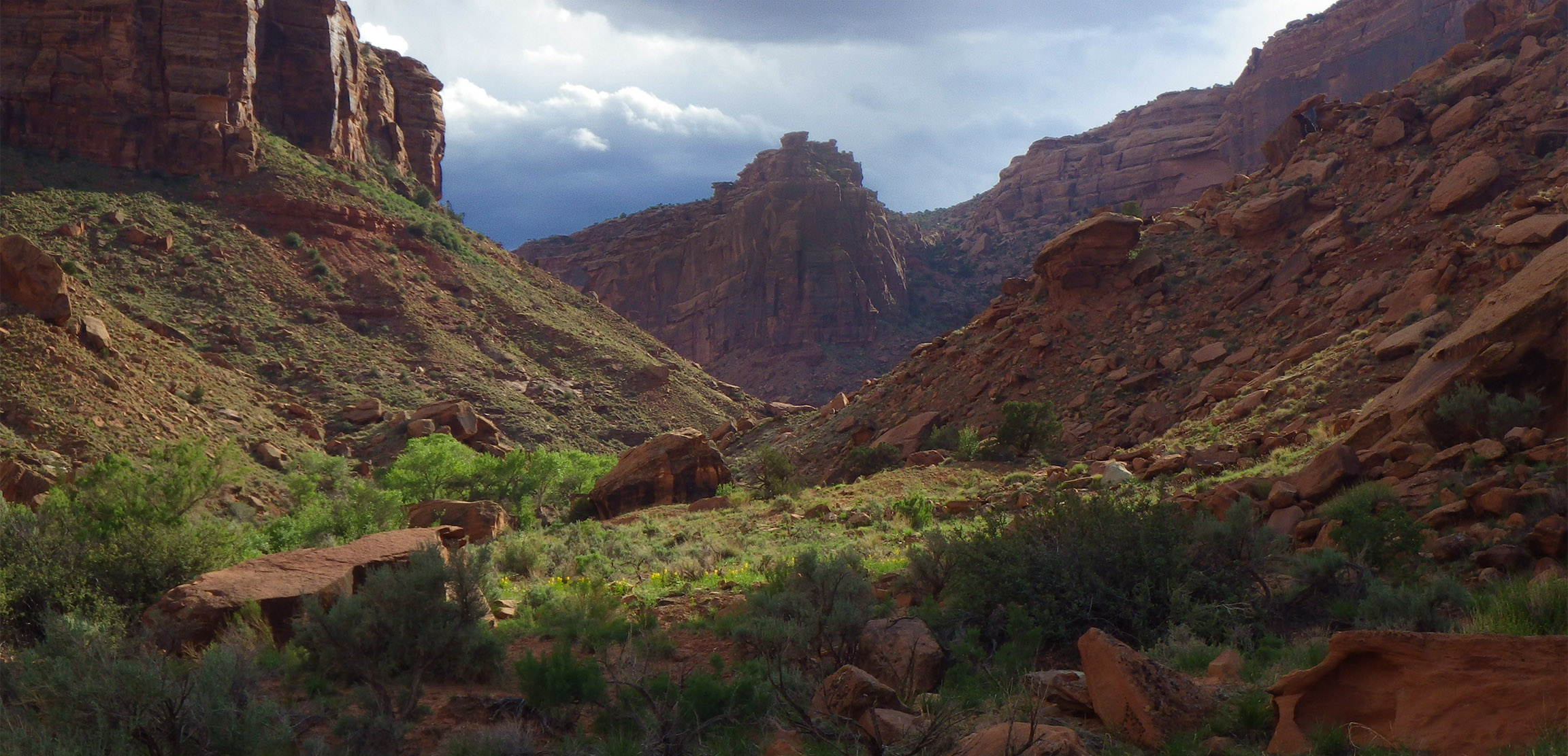 Traveling down canyon was somewhat tough as there wasn’t a great trail and the brush near the stream was fairly thick. Soon I was surprised to see the nice flow of creek dissipate and become intermittent. When the creek dried up completely I backtracked a bit and filled up my jugs just in case Kane Creek was dry ahead. The lower end of the canyon has more cow presence too which was a real bummer. Looking back up the canyon another storm seemed to be moving in: