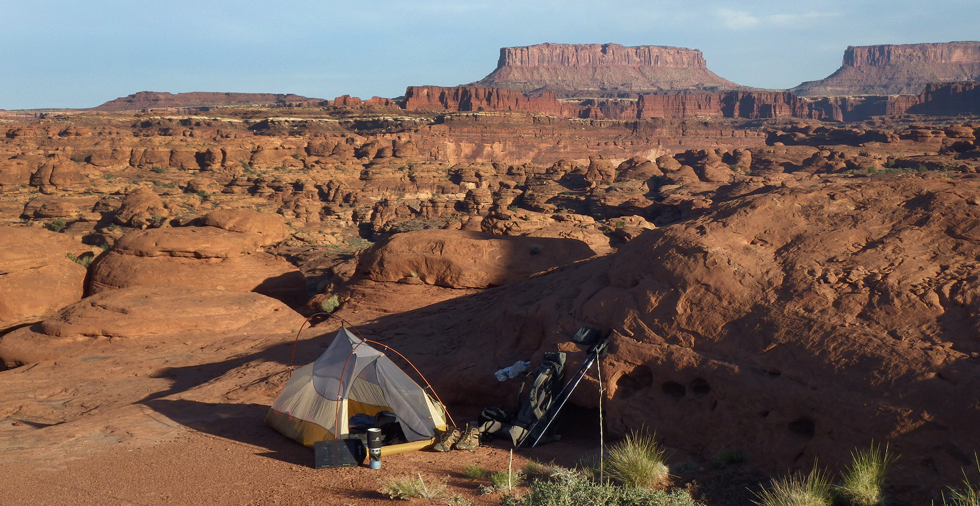 The permit for the zone I wanted to camp was taken (Needles North), so I ended up with Red Lake/Grabens. I was nearing the edge of this zone. So… I had to decide if I could push hard and make it out of the park (and not need a permit) or drop pack and call it an early day. Since it had already been a tough day — it didn’t take too much contemplation. I actually decided to not just kick back at camp and instead did the side hike out to Confluence Overlook for sundown. Awesome place, but unfortunately the late-day sun was bad and the rivers once again both ran muddy. One day I really hope to be here when there is a great mix of the rivers. I made it back to my camp just as the sun was going down on Cyclone Canyon: