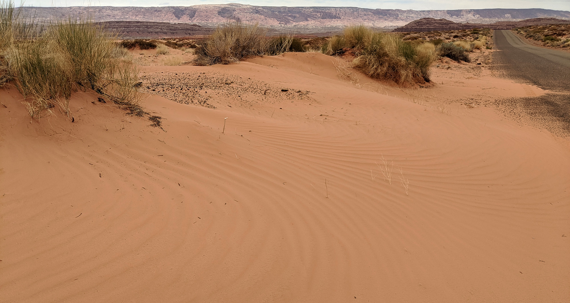 sand encroaches on road along Burr trail